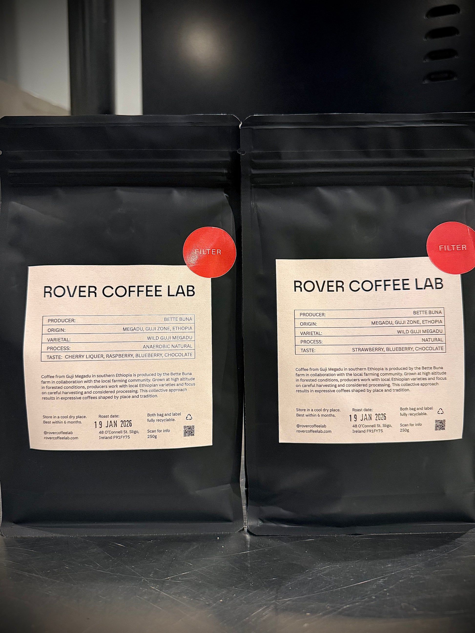 From Bette Buna in Guji, Ethiopia, the same lot is processed two ways, Natural and Anaerobic Natural — resulting in two distinctly different expressions.